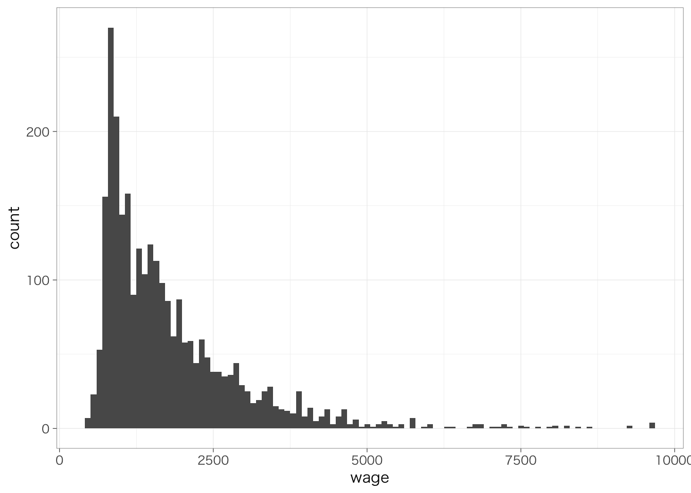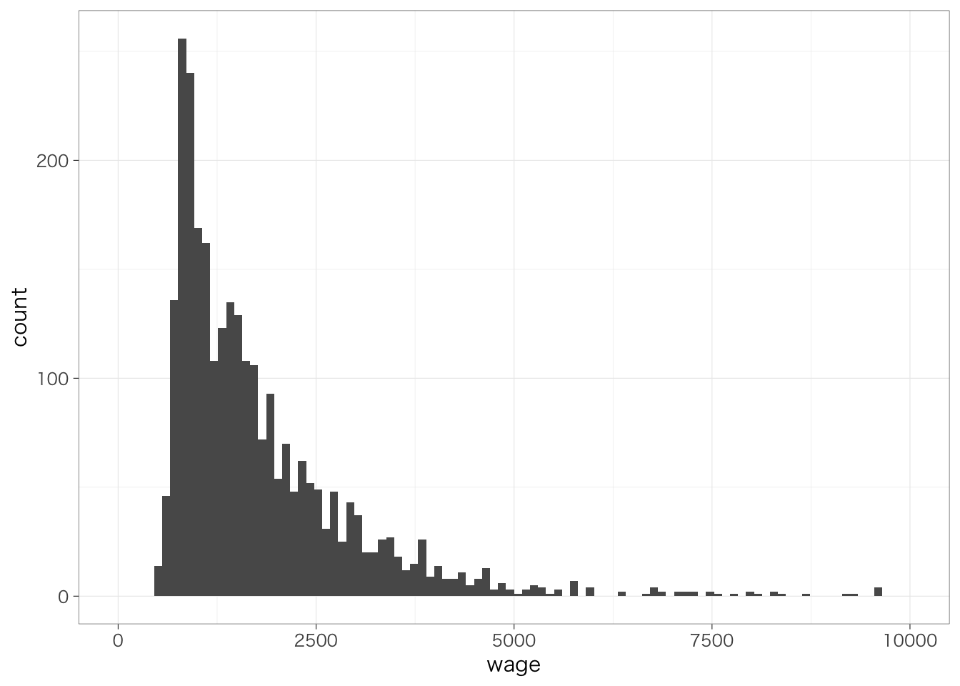 ggplot()という部分が、グラフを書くための準備をしている箇所である。aes()のなかでは、x軸やy軸にそれぞれ何の変数を取るのかであったり、どのような色で分けるのか(後述)などを指定する。今の場合であれば、x軸にwageをとる、ということを指している。上記の命令だけだと、このようにx軸のみが表示された空白の座標が準備される。