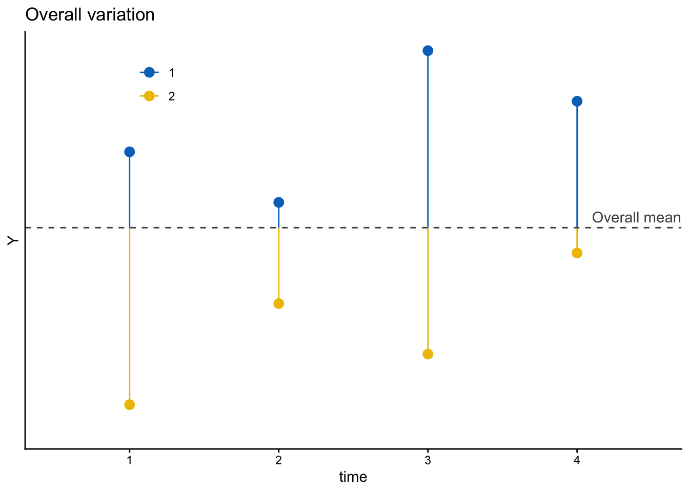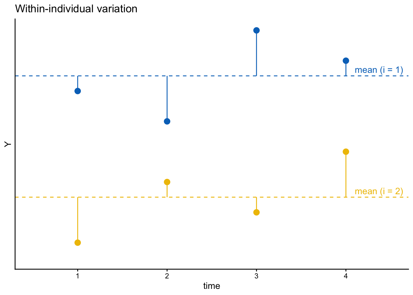 時間可変の変数の場合、その変動(variation)を個人内変動(within-individual variation)と個人間変動(between-individual variation)に分けることができる。たとえば、4時点の調査を行い、各個人について計4回分の\(Y_{it}\)の値を得られたとしよう。このとき、2人の個人(1, 2)について得られた値(値は架空のもの)をプロットしたのが次の図である。縦軸が\(Y\)の値、横軸が時点\(t\)を表す。