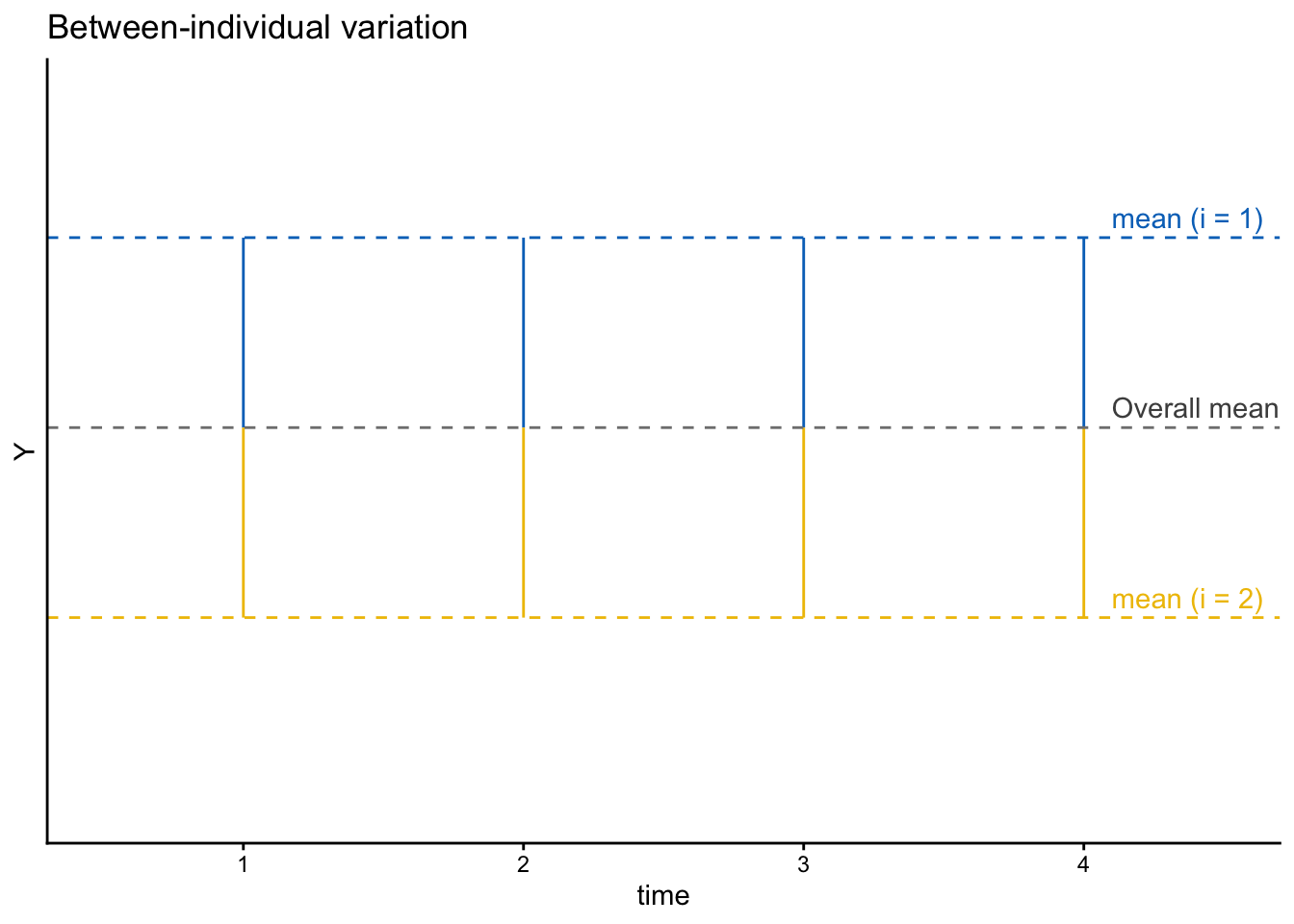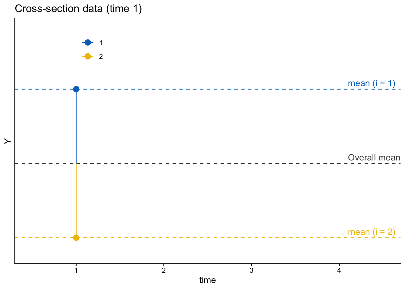 1時点の観察しか得られていない場合、仮に理論上は時間可変の変数であったとしても、変数のばらつきが個人間変動によるものなのか、個人内変動によるものなのかを区別することはできない。この場合の図は次のようになり、各観察の値と個人内平均は完全に一致してしまう(\(Y_{it} = \overline{Y}_i\))。そのため、個人間変動と個人内変動を分けることができない。