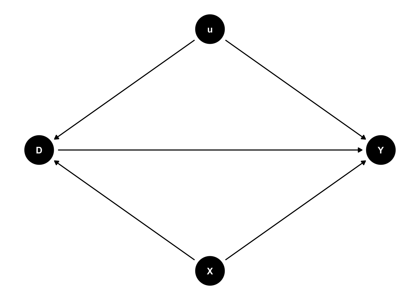 固定効果モデルは因果効果の推定にとっての万能薬ではない34。とくに最も重要なのは、推定に含まれていない時間可変の要因については何ら解決策を与えるものではないということである。従属変数をY、関心のある時間可変の独立変数をD、その他の時間可変の独立変数をX、時間不変の個人特性をuと表すことにする。このとき、固定効果モデルの想定をDAGにして表したのが次の図である。ここに含まれていない時間可変の要因が原因(D)と結果(Y)の両方の交絡要因となっていれば、Dの係数にはバイアスが生じることになる。