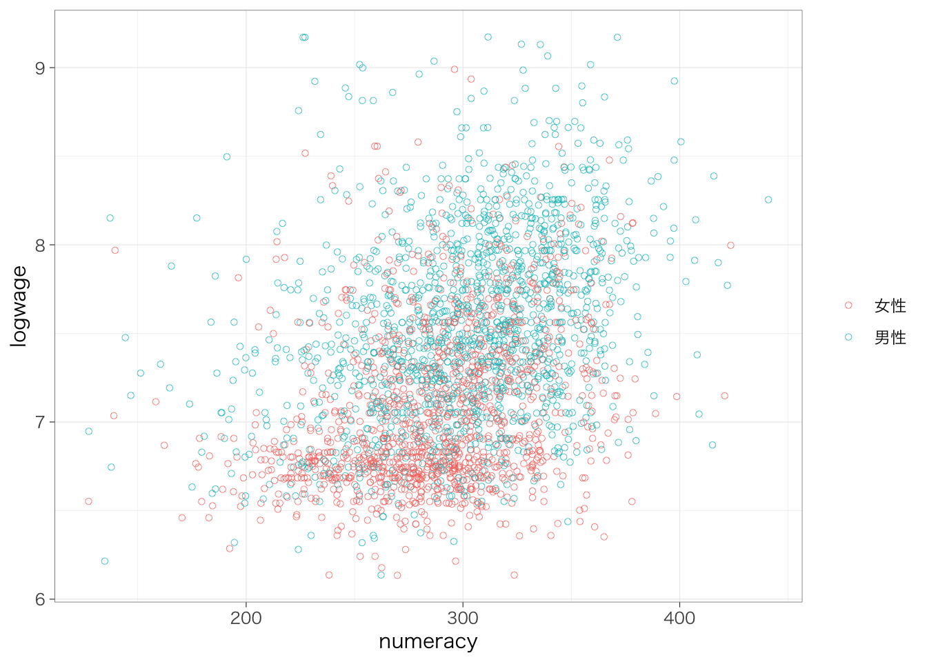 今回の場合、単回帰分析ではこのような因果効果を明らかにすることはできない。たとえば、女性はさまざまな理由から男性と比べて数的思考力スコアが低い傾向がある19。また、女性はさまざまな理由から労働市場で男性と比べて高い賃金を得られていない。だとすれば、数的思考力スコアが高いと賃金が高いというのはたんに見かけ上の関係に過ぎず、実際には数的思考力スコアは何ら賃金を高める効果を持っていないのかもしれない。性別に色分けした以下の散布図を見てみよう。たしかに、数的思考力も高く対数賃金も高い右上には男性が、数的思考力スコアが低く対数賃金も低い左下には女性が、それぞれ集中しているようにみえる。