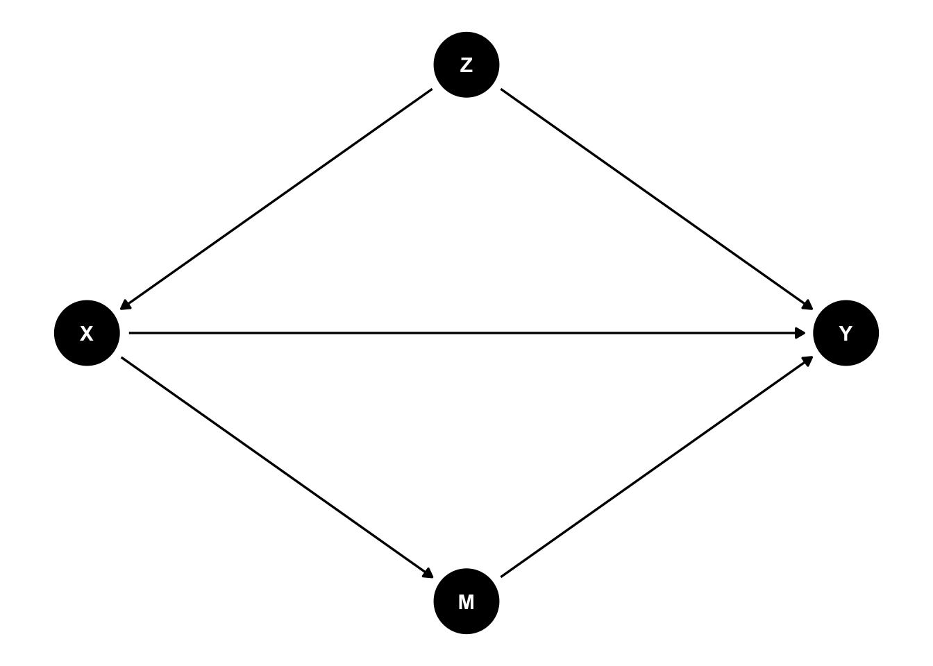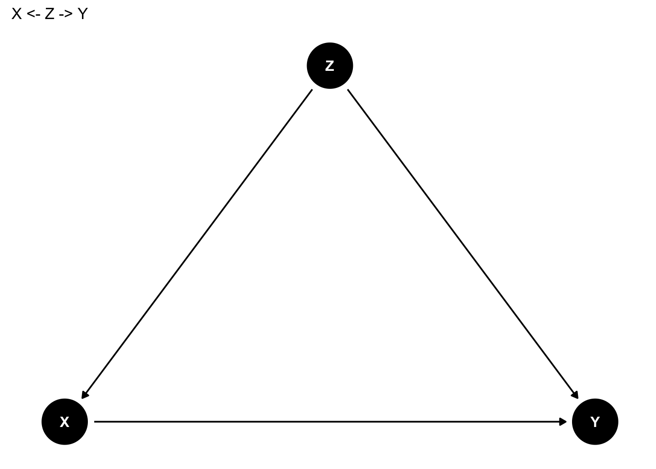 Xを数的思考力スコア、Yを賃金、Zを性別と考えよう。知りたいのは数的思考力スコアが賃金に与える効果(X → Y)だが、その背後にはXにもYにも影響する要因Z(Z → X、Z → Y)が存在する。そのため、数的思考力スコアが賃金に与える効果をみたいのならば、Zを一定とする必要がある。このように、XとYの両者に影響する要因を交絡要因 confounderとよぶ。